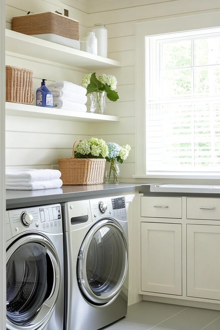 - Storage Solutions: Incorporate neatly folded clothes on open shelves and use white appliances such as washers and dryers to maintain a cohesive look.