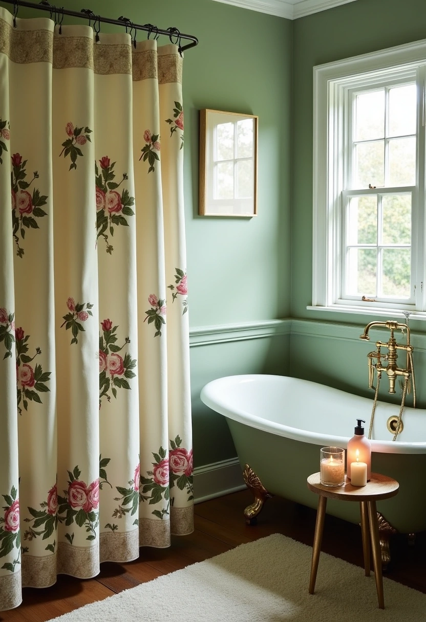 Experience a rustic bathroom featuring a vintage-style shower curtain adorned with floral patterns, paired with a clawfoot tub and brass fixtures that define the cottagecore aesthetic. A small side table holds essential oils and candles, creating a spa-like feel that invites relaxation.