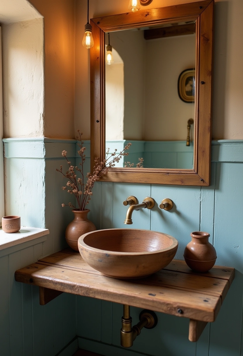 Step into a cozy bathroom featuring a rustic wooden sink with vintage brass fixtures, beautifully complemented by handmade pottery for storage. The vintage mirror reflects warm, ambient lighting, enhancing the warm beige and soft blue color scheme that envelops the space.