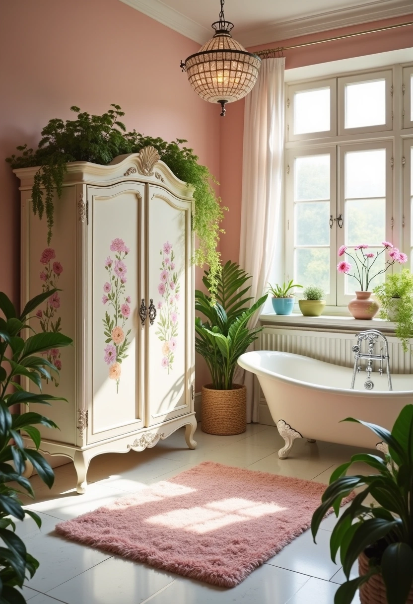 Welcome to a dreamy bathroom space featuring a vintage armoire transformed into towel storage, showcasing soft pastel colors and hand-painted floral designs. This creative repurposing adds both functionality and charm to the room, blending seamlessly with the overall cottagecore aesthetic.