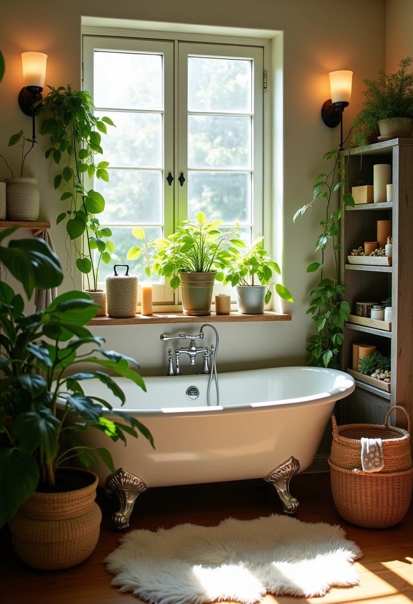 This delightful cottagecore bathroom features a sunlit corner with a vintage clawfoot tub surrounded by lush indoor plants. The arrangement is enhanced by a rustic wooden cabinet displaying handmade soaps and candles, all illuminated by warm, ambient lighting.