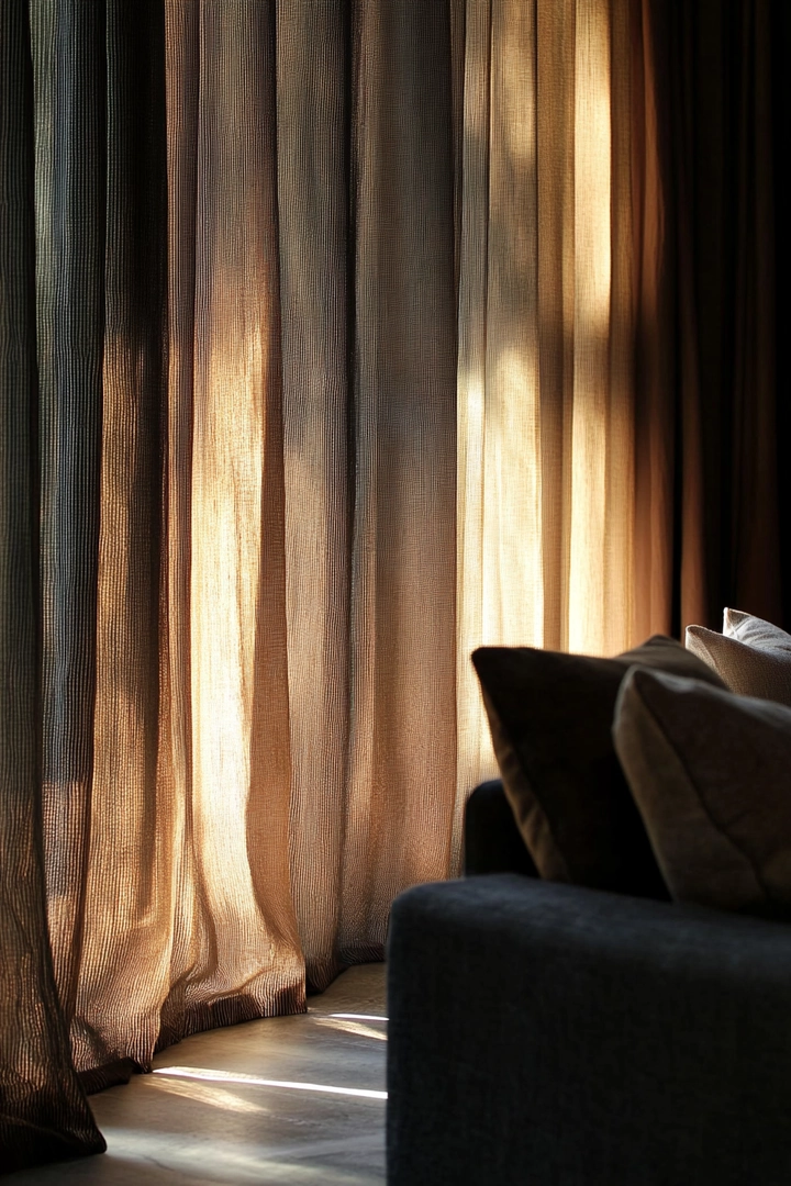 Design Tip: Use indirect lighting, like hidden LED strips or floor lamps, to highlight the textures of the curtains and create depth.