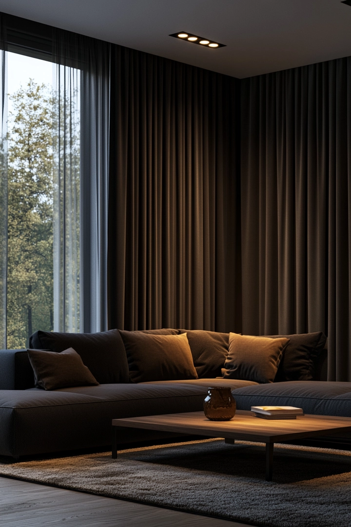 Bold dark curtains make a stunning impact in this stylish living room, harmonizing with a dark sofa and a wooden coffee table. The luxurious material of the drapes catches the soft glow of ambient light, creating a dramatic yet comfortable atmosphere. This design perfectly balances modern style with a warm, inviting feel.