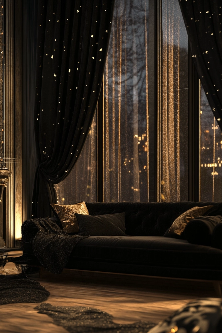 A sleek living room comes alive with bold, dark curtains that frame large windows. The dramatic look of the drapes is enhanced by a modern dark sofa and minimalist art, creating a balanced and stylish space. Soft, warm lighting adds a touch of comfort, ensuring that the design feels both trendy and inviting.