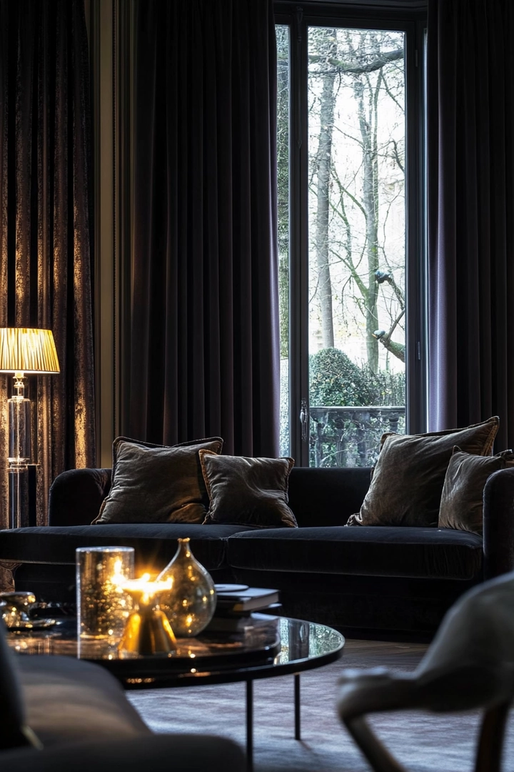 This refined living room design features luxurious dark curtains that frame large windows with a touch of elegance. The heavy, velvet-like fabric of the drapes complements stylish dark furniture, while soft warm lighting brings out every rich detail. The result is a calm and sophisticated atmosphere perfect for unwinding.