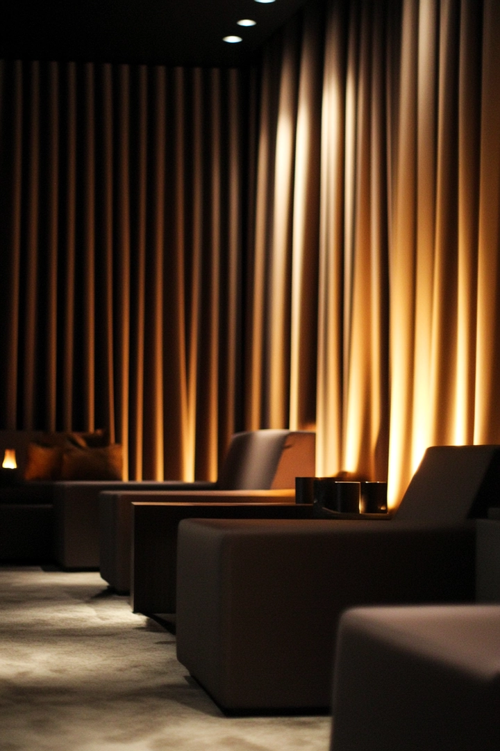 Dramatic dark curtains in this living room create an elegant enclosure around the space. Paired with a sleek dark sofa and modern furnishings, the rich texture of the drapes adds depth and mystery. Soft, ambient lighting highlights every detail, making the room a perfect mix of modern sophistication and comfort.